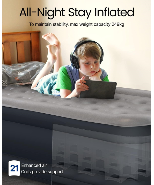 40 internal air coils to enhance durability and support, keeping your bed flat and firm. The mattress will not tilt or flip if you sit on its edge or corner. Queen size, with inflated dimensions of 203*152*46cm and a weight capacity of 295kg, suitable for moving families, avid campers, guest beds, etc. An anti-slip bottom keeps the mattress stable and silent, protecting your quality of sleep.
